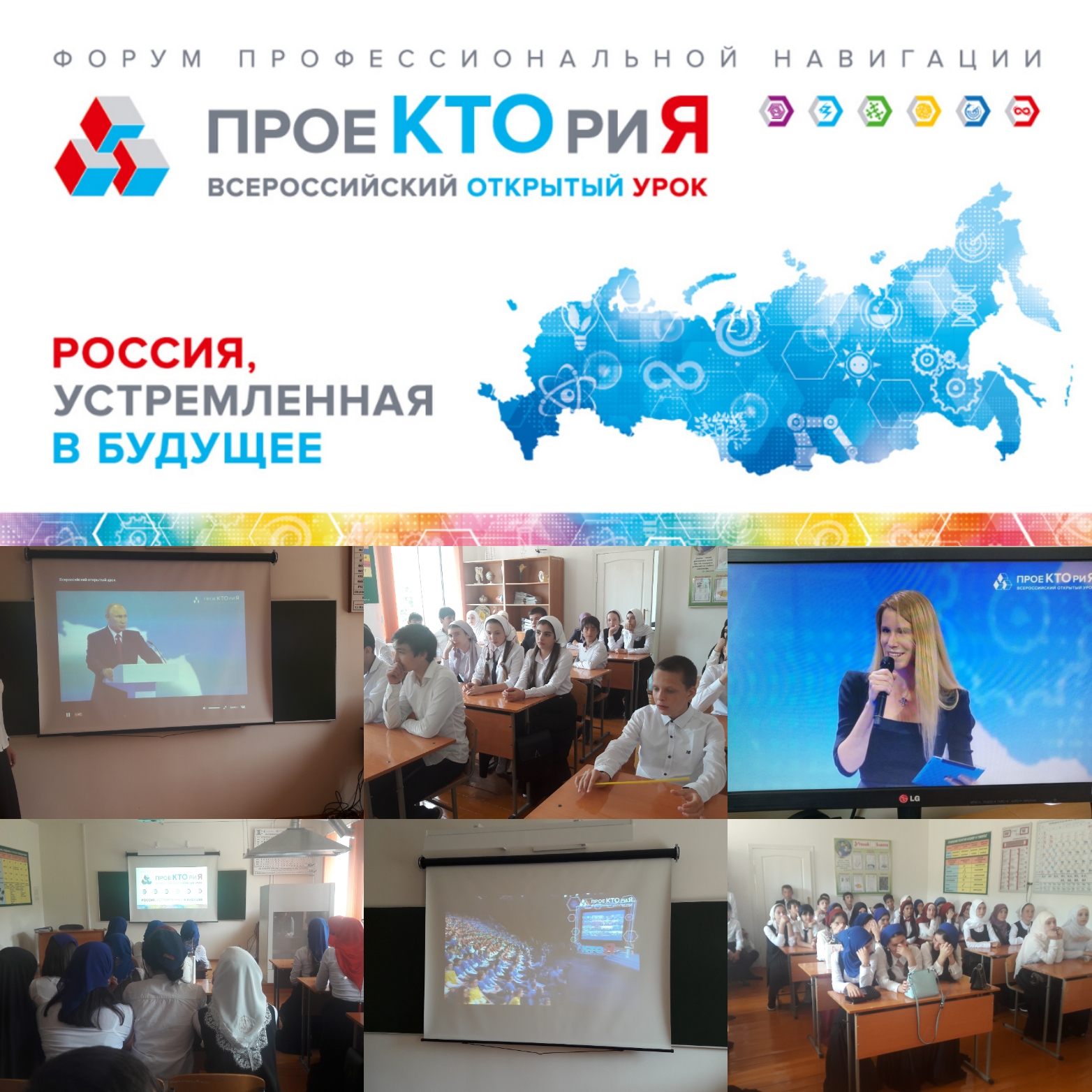 После линейки все зашли в классы и провели первый урок на тему "Россия, устремлённая вперед". Учащиеся 9-11 классов участвовали в онлайн-трансляции всероссийского урока "ПроеКТОриЯ".
