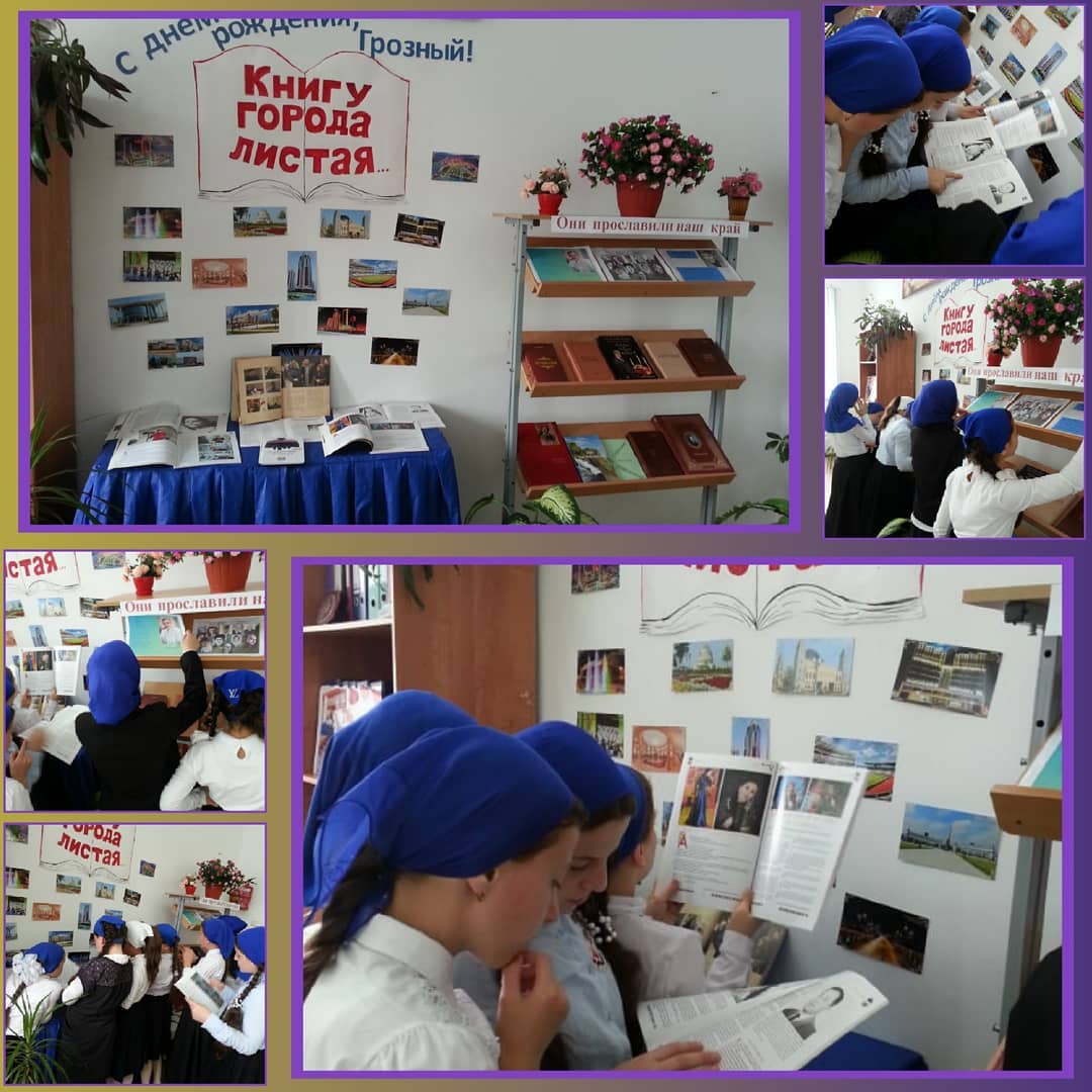 Мы любим наш город Грозный! Мы делаем все возможное, чтобы эту любовь вложить в сердца нашим учащимся. Чтобы каждый ребенок знал о Грозном, его боевой славе, знал своих писателей, музыкантов, художников — наших знатных земляков.Таким образом, заведующей библиотекой Муртазовой З. в библиотеке была оформлена выставка, посвященная Дню города «С днем рождения, любимый город!», на которой представлены книги о родном крае. Дети рассматривали яркие иллюстрации современных изданий книг, читали интересные сведения и факты о Грозном, обсуждали прочитанное.